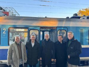 Στη συνέχεια, ο Αντιπρόεδρος της Κυβέρνησης πραγματοποίησε διαδρομή με τον Δυτικό Προαστιακό Θεσσαλονίκης, που συνδέει τον Νέο Σιδηροδρομικό Σταθμό με τη Σίνδο και τη Βιομηχανική Περιοχή Θεσσαλονίκης, μαζί με τον Αντιπεριφερειάρχη Θεσσαλονίκης, Κωνσταντίνο Γιουτίκα.